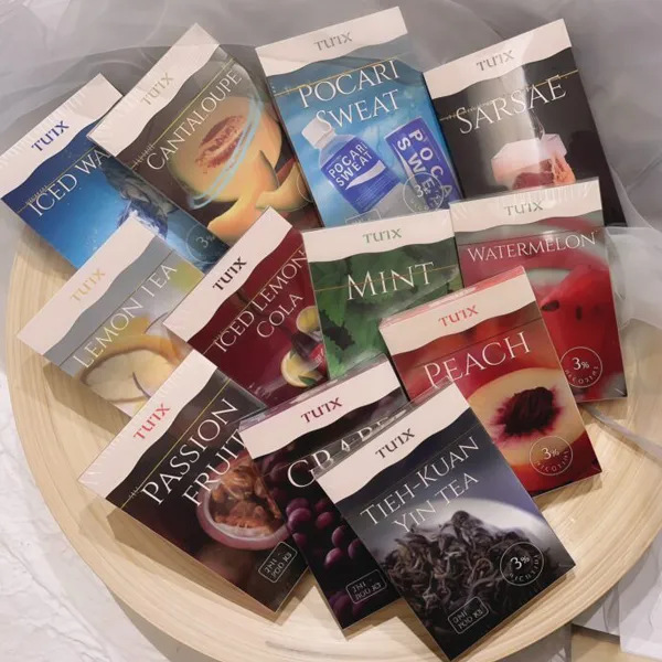 | TUTX 一代煙彈口味 | 冰鎮龍井, 凍檸可樂, 南極冰, 哈密瓜, 奇異果, 寶礦力, 檸檬, 水梨, 沙士, 百香果, 綠豆, 老冰棍, 芒果, 芭樂, 荔枝, 莓果, 菸草, 葡萄, 蔓越莓, 薄荷, 藍莓, 蘋果, 蜜桃, 西瓜, 鐵觀音, 鳳梨 |